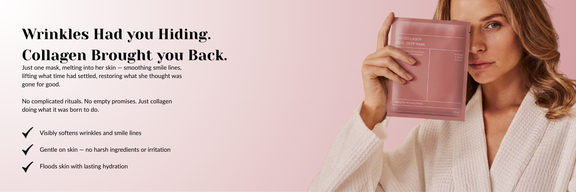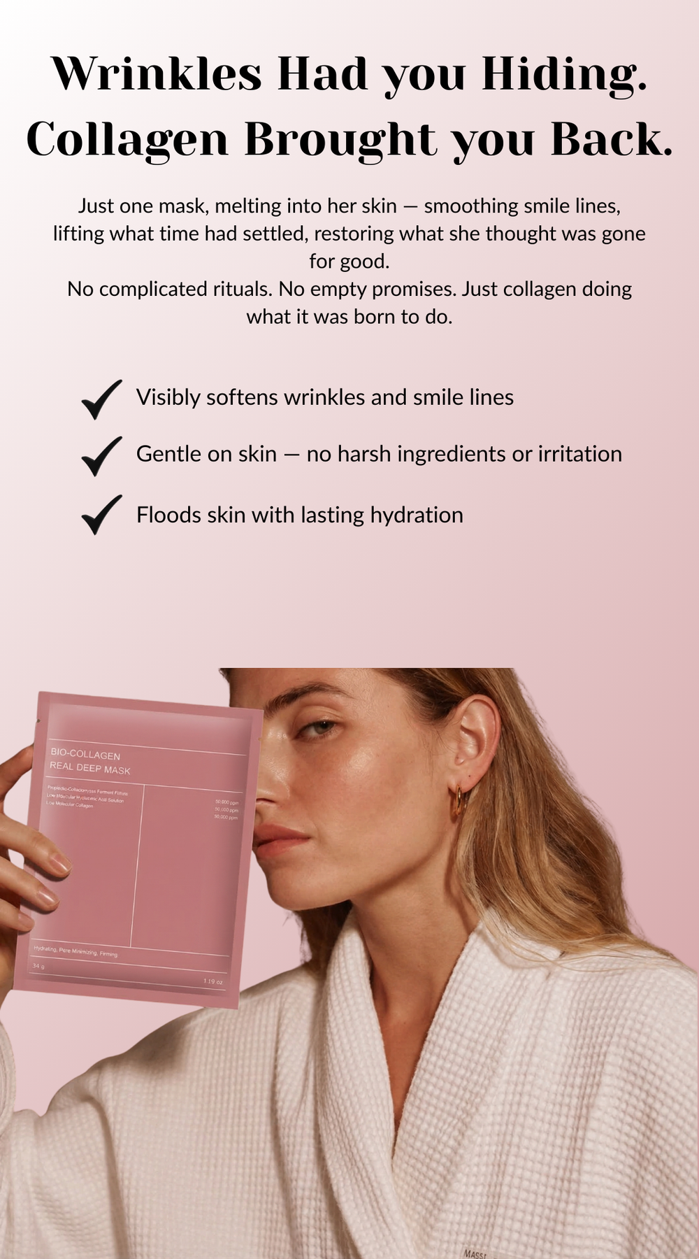Experienced firmer, younger-looking skin with consistent use— deeper wrinkle reduction and lasting hydration within 2–4 weeks of daily masking.